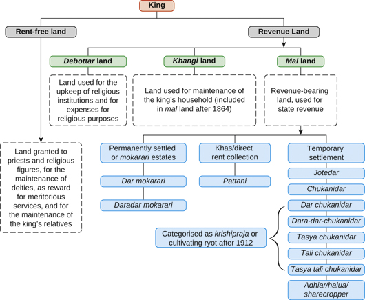 On the eve of independence, Cooch Behar’s land tenure system was characterised by extreme levels of subinfeudation and a highly differentiated peasantry, a complex admixture of pre-colonial feudatory traits and tenurial changes introduced by the British administration. Figure 1, which derives from Chaudhuri (1903), Ganguli (1930), and Todarmal (2002), illustrates the complex structure of land tenure in Cooch Behar at the time of independence. As the diagram shows, subinfeudation — or the number of layers between the actual cultivator and the titular owner of land — was greatest on temporarily settled revenue land.