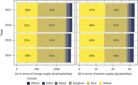 Over the last few decades, wheat has become an integral part of the daily diet in regions of India where the crop has never been cultivated (e.g., Kerala). Wheat has become the second major energy source after rice, and the most important source of protein for Indian households from cereal consumption (Figure 1). In the foreseeable future, the per capita consumption of wheat is projected to remain unchanged at around 5 kg/month (Alae-Carew et al. 2019). These average values, however, conceal the prevailing inequality in wheat consumption, particularly in rural India, where the poor struggle to meet the required quantities of cereal consumption despite the targeted public distribution system (PDS) (Mukesh et al. 2019).