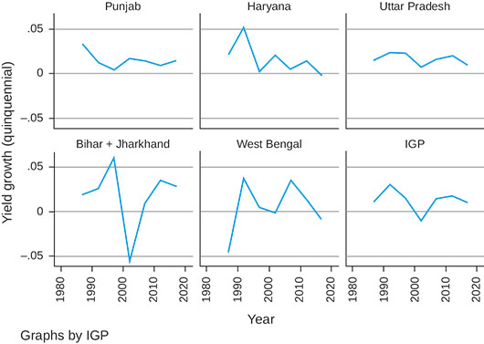 Despite high productivity, the sustainability of wheat production systems of the IGP has been questioned in the post-Green Revolution period. Concern has been raised about the negative environmental externalities associated with unsustainable intensification practices in the rice–wheat systems (Krishna et al. 2012; Pingali 2012), and vulnerability to climate change (Ortiz et al. 2008; Gupta, Somanathan, and Dey 2017; Mukherjee and Huda 2018) and biotic stresses (Mottaleb et al. 2018). Productivity growth has remained sluggish across the States post-Green Revolution, with the quinquennial growth rate in wheat yield remaining below two per cent for most of the period (Tripathi and Mishra 2017; Ramadas et al. 2020).
