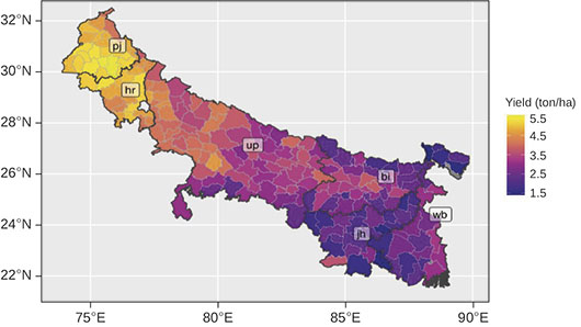 An important question that arises here is whether the inferior performance of the Eastern region is due to a comparatively low yield potential, or inadequate and incompatible technological change. Our analysis focuses on the district-level wheat yield data (Figure 3), which reveal a discernible gradient for wheat yields from the Western IGP to the Eastern IGP. Yield disparity has been in the range of 1.5–5.5 tonnes/hectare across the IGP districts. A smooth transition in yield across State boundaries depicts a relatively lower impact of State-specific interventions on wheat yield and the significance of agroclimatic factors. However, the Haryana–Uttar Pradesh and Jharkhand–West Bengal borders show discontinuous yield patterns. Similar patterns were also observed in remote sensing (Jain et al. 2017). These discontinuities imply the (in)effectiveness of agricultural policies of the State and associated institutions to help farmers achieve the potential yield. The results also show significant within-State variation, especially for Uttar Pradesh and Bihar, which could correspond to varying levels of technological progress, infrastructure, and market development within the State. However, the spatial variation could also arise from differences in the attainable yield due to differing agroclimatic congeniality. We estimated the yield gap (i.e., attainable yield minus actual yield) across districts.