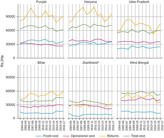 Unlike in the case of labour, there was no striking temporal or spatial difference in the cost share of material inputs such as seeds and chemical fertilizers. Due to heavy government subsidies, irrigation charges were low in Punjab in comparison to the rest of the IGP. Because a large share of the wheat is cultivated on leased-in land, the share of lease value in total cost was high in Punjab but negligible in other States. One may expect a relatively high cost of cultivation in the West to realise and maintain high land productivity. The costs and returns of wheat cultivation over 2004-05 to 2016-17 are shown in Figure 5. Indeed, the cost of cultivation of wheat, especially the fixed cost component, was high in Punjab and Haryana (Rs 60,000–70,000/hectare) as compared to Bihar and Jharkhand (Rs 30,000–40,000/hectare). However, the returns from wheat cultivation were also high in the West (Rs 90,000–100,000/hectare), making wheat cultivation a profitable enterprise for farmers. On the other hand, the difference between returns and total cost was small but positive in Uttar Pradesh and Bihar, and negative in Jharkhand and West Bengal. The negative returns occurred despite the negligible fixed cost component.