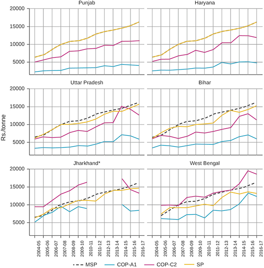 Notes: * The costs data of Jharkhand from 2011-12 to 2013-14 were unrealistically high, and are hence removed from this analysis. MSP = minimum support price; SP = selling price obtained by farmers; COP = cost of production.