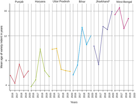 Across the IGP States, there exist significant differences in the cost of wheat cultivation per land unit. However, the per unit CoP (cost incurred to produce one kg of wheat grain, measured as Rs/kg) does not vary significantly between Punjab, Haryana, Uttar Pradesh, and Bihar. The CoP peaked in these States in 2016–17, at around Rs 11–12/kg, but lay below the supply price and the MSP (Figure 6). On the other hand, strong fluctuations were observed in the CoP of wheat in Jharkhand and West Bengal. Here the CoP often surpassed the supply price, resulting in financial losses to farmers. The CoP figures show structural differences in wheat production across the IGP. While farmers of Punjab and Haryana benefited from economies of scale, farmers of Bihar benefited from low wage rates (Table 4). Punjab farmers invested heavily in wheat to get higher yields, as indicated by their higher total cost of cultivation (Rs/hectare) in Figure 5, whereas Bihar farmers spent less on wheat and harvested less. From an ecological perspective, the Bihar scenario would generate fewer environmental externalities due to the low dependence on chemical fertilizers and herbicides, although the low input application was due to the credit constraints of farmers (i.e., the lack of access to formal credit), ill-developed input supply chains, and bottlenecks in agricultural extension. Nonetheless, the yield and gross margin generated per land unit were significantly high in Punjab, which is important for increasing national wheat production and farm income under irrigated conditions. In this section, we examine the differences in the pattern of technology changes across the IGP, taking the case of improved varieties (a divisible factor) and mechanisation (an indivisible factor) in wheat.