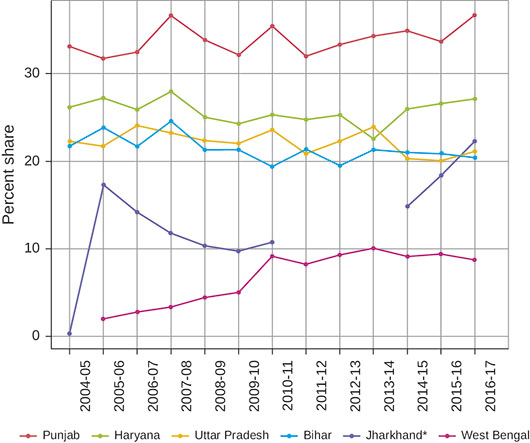 Note: * Jharkhand data from 2011–12 to 2013–14 were unrealistically high (by about 40 per cent), and hence removed from the analysis.